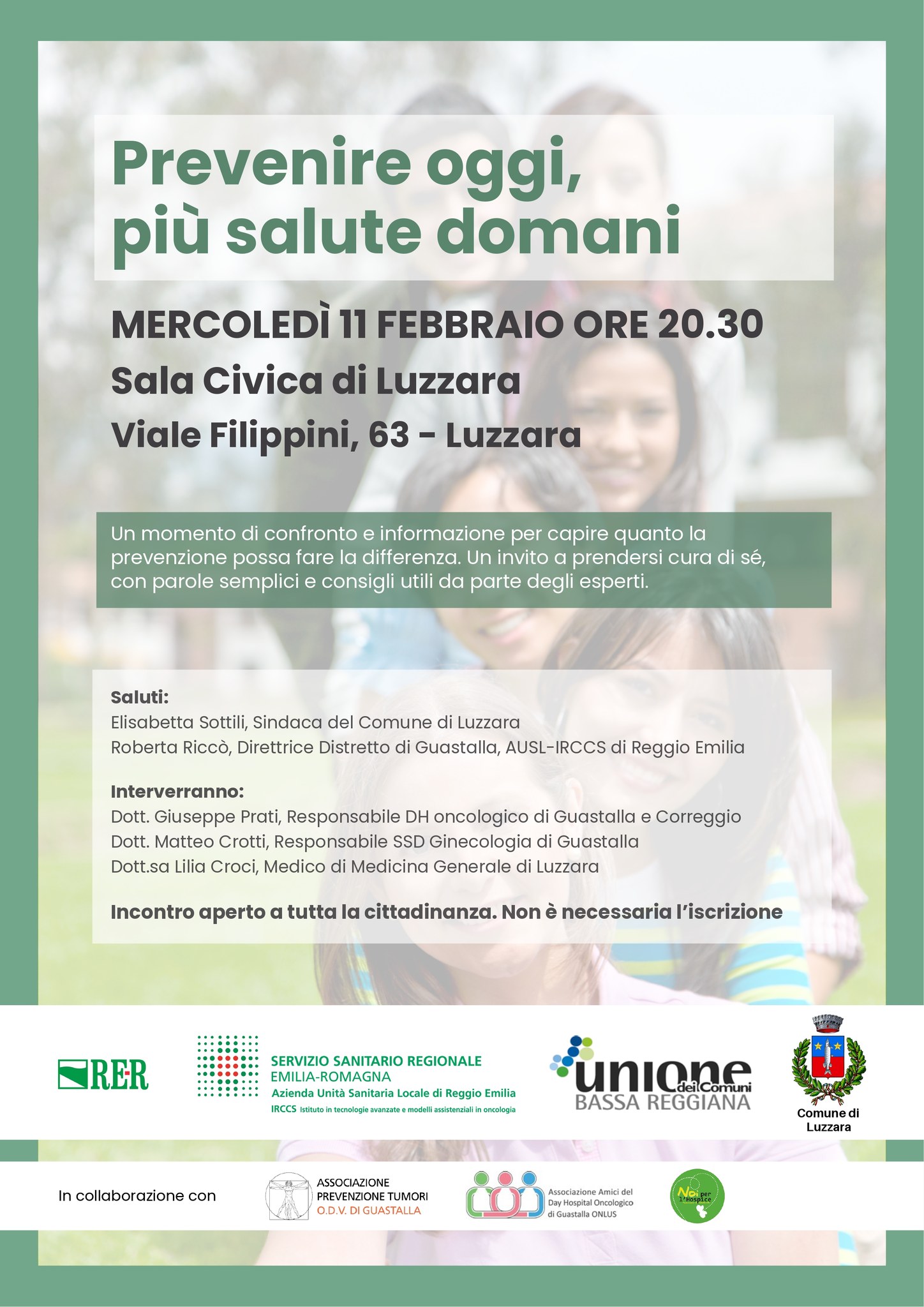 Incontro pubblico per informare, confrontarsi e promuovere la cultura della prevenzione, con il contributo di professionisti della sanità. presso la Sala Civica di Luzzara, viale Filippini 63.